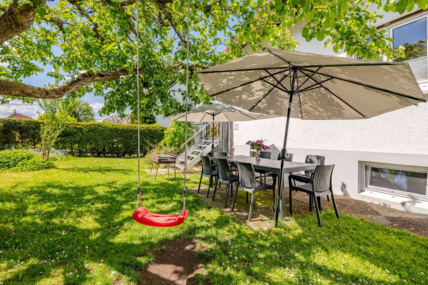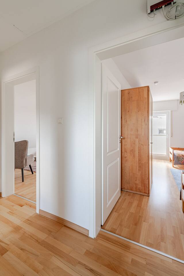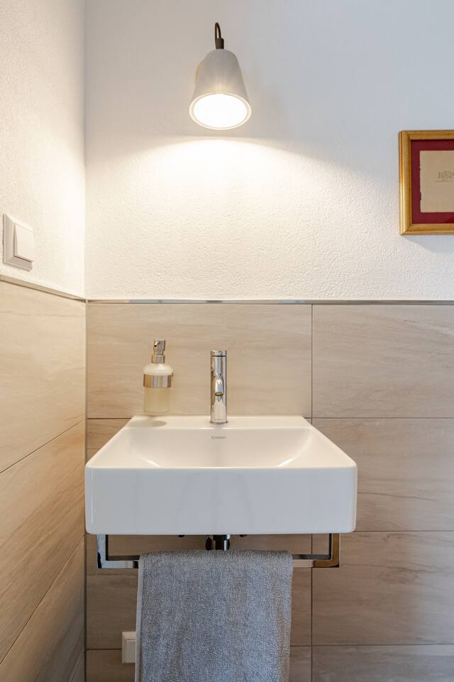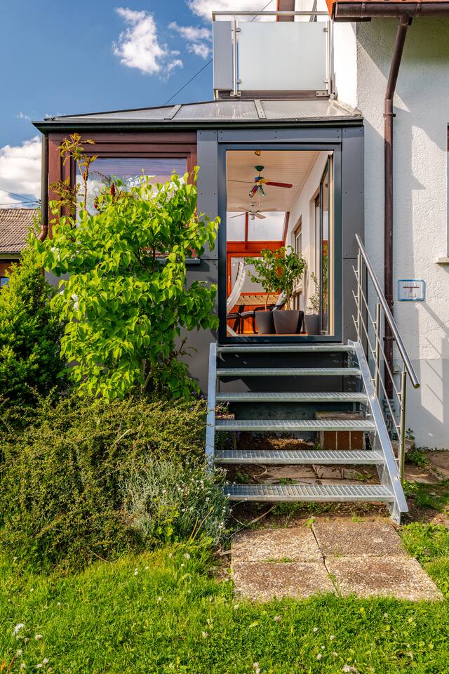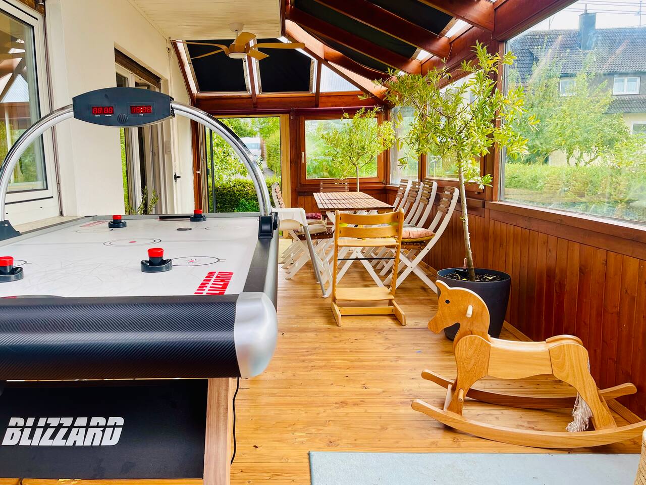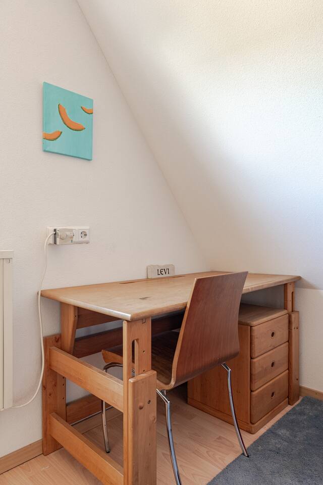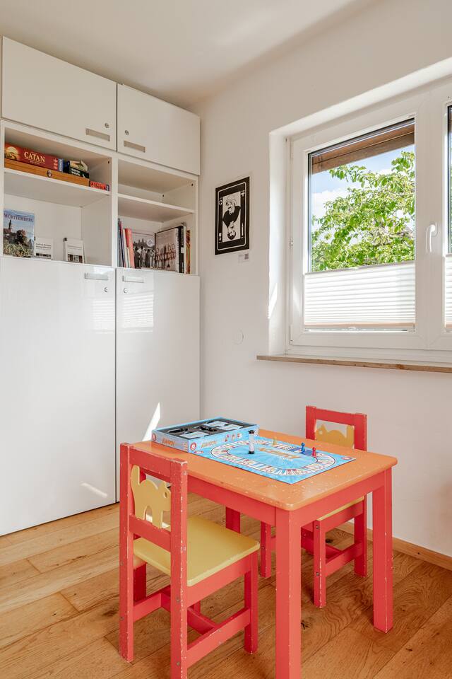 Ground floor: Spacious living-dining area. Fully equipped open kitchen incl. dishwasher. Antique dining table. Barista coffee machine. Warming stove (with uncomplicated oil central heating). Comfortable sofa invites you to linger and watch the 75 inch Smart-TV. Piano. Conservatory with citrus plants, further dining table, table football, toys. Guest WC. Upstairs with 3 bedrooms and spacious bright bathroom. Room 1: A king-size (200 x 200 cm) comfort bed ("Hüssler-Nest"). Room 2: Double bed (140 x 200 cm) and desk. Room 3: Two single beds (90 x 200 cm), children's books, toys to share and a desk. Basement: 1 bedroom and laundry room. Room 4: A pull-out day bed (160 x 200 cm) and a desk with Smart TV. Laundry room: Washing machine and tumble dryer. Garden: Detached house surrounded by garden with two shady apple trees and barbecue. Two parking spaces available on the property and free public parking. An electric car can be charged at the house with charging power limited to 2.4kW. 22kW connection in 800m. Wifi up to 50Mbit/s Expect to find everything you need for a perfect stay for one or two families with small and big children or as an adult travel group with up to 8 people plus an infant.