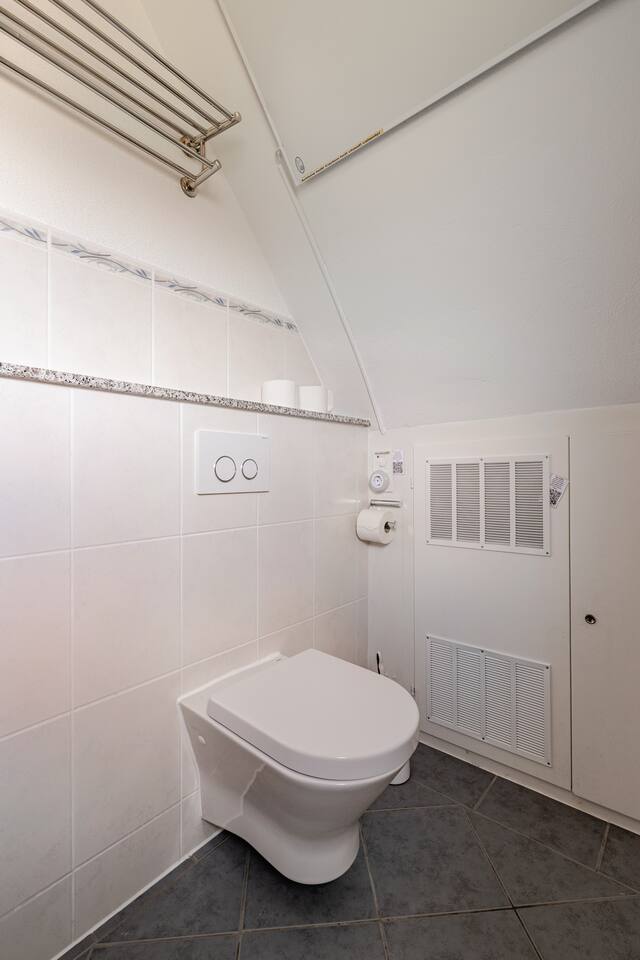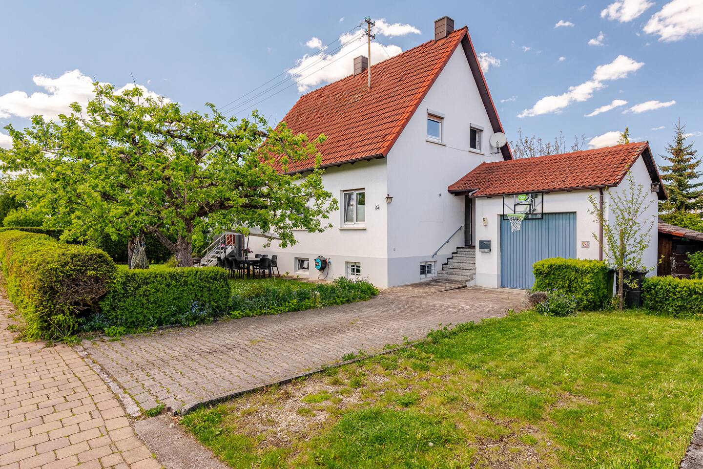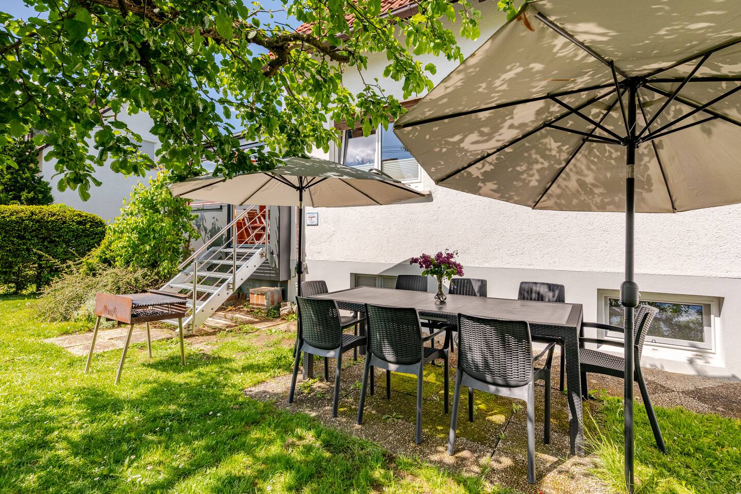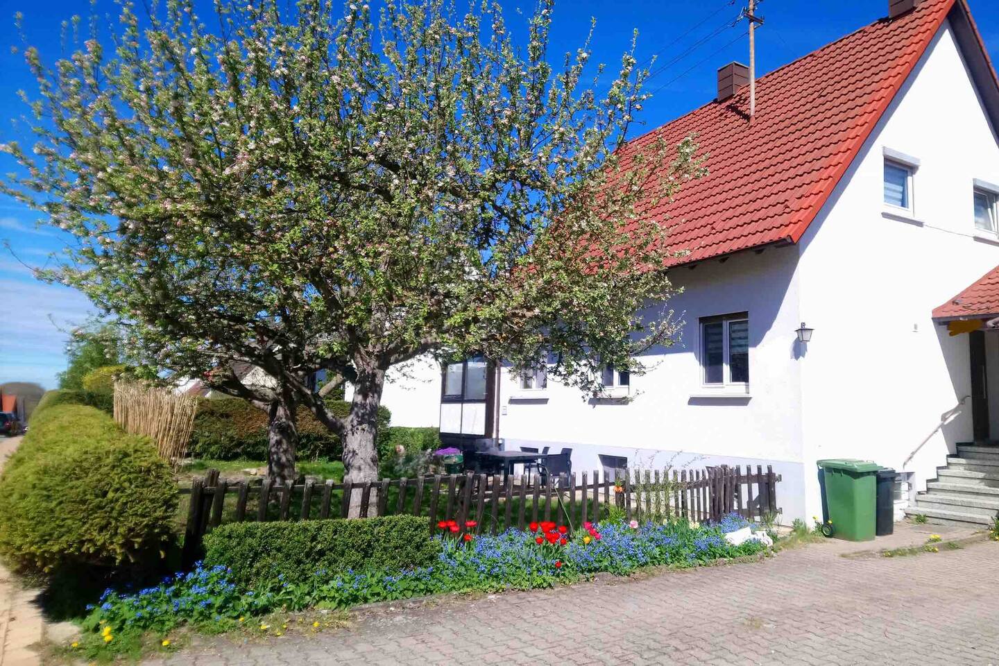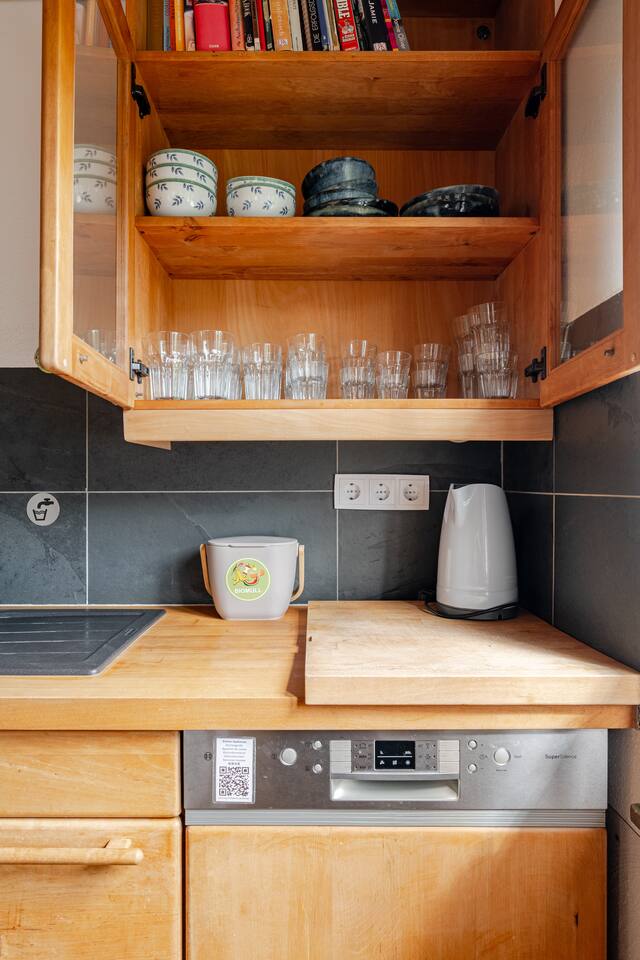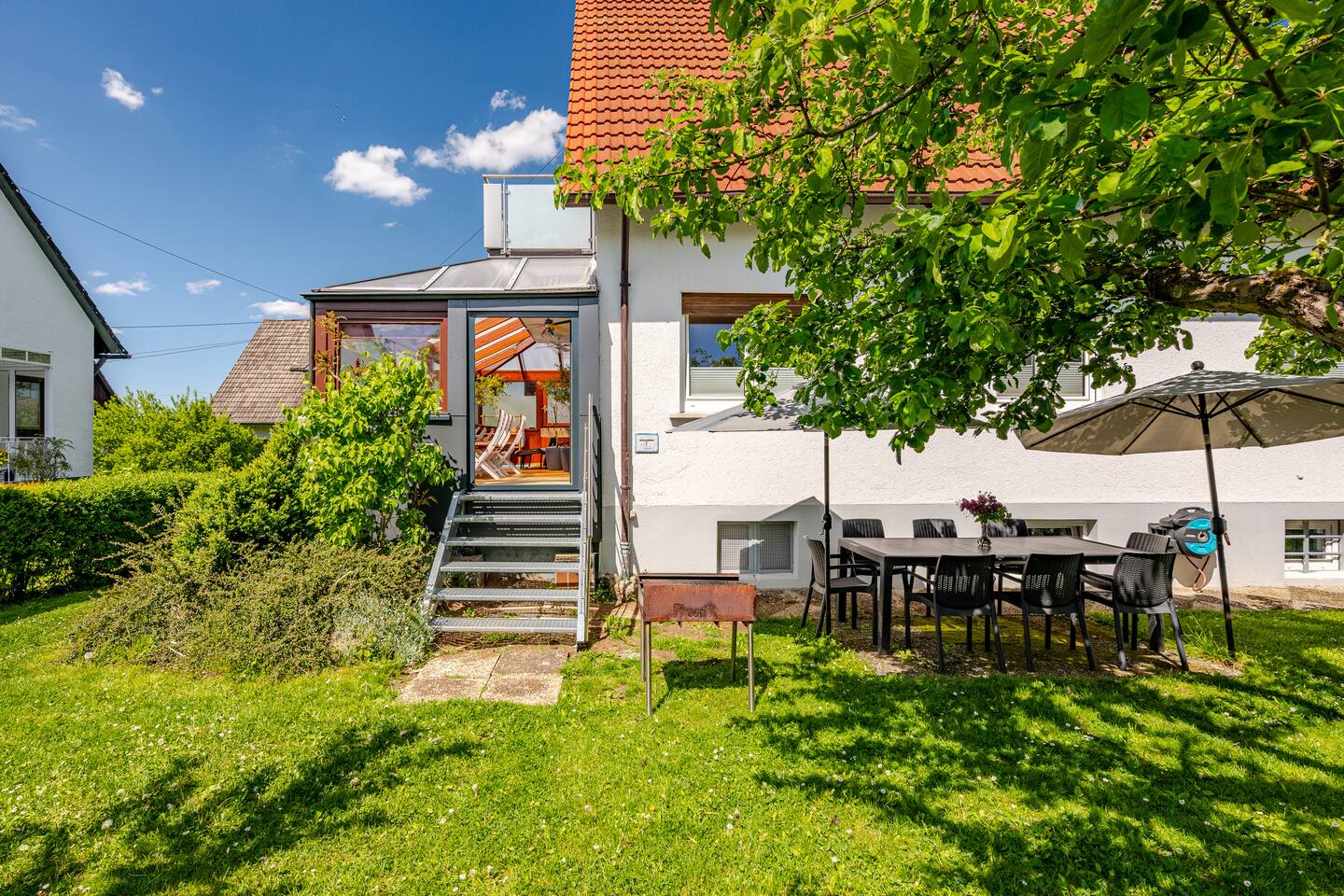 Ground floor: Spacious living-dining area. Fully equipped open kitchen incl. dishwasher. Antique dining table. Barista coffee machine. Warming stove (with uncomplicated oil central heating). Comfortable sofa invites you to linger and watch the 75 inch Smart-TV. Piano. Conservatory with citrus plants, further dining table, table football, toys. Guest WC. Upstairs with 3 bedrooms and spacious bright bathroom. Room 1: A king-size (200 x 200 cm) comfort bed ("Hüssler-Nest"). Room 2: Double bed (140 x 200 cm) and desk. Room 3: Two single beds (90 x 200 cm), children's books, toys to share and a desk. Basement: 1 bedroom and laundry room. Room 4: A pull-out day bed (160 x 200 cm) and a desk with Smart TV. Laundry room: Washing machine and tumble dryer. Garden: Detached house surrounded by garden with two shady apple trees and barbecue. Two parking spaces available on the property and free public parking. An electric car can be charged at the house with charging power limited to 2.4kW. 22kW connection in 800m. Wifi up to 50Mbit/s Expect to find everything you need for a perfect stay for one or two families with small and big children or as an adult travel group with up to 8 people plus an infant.