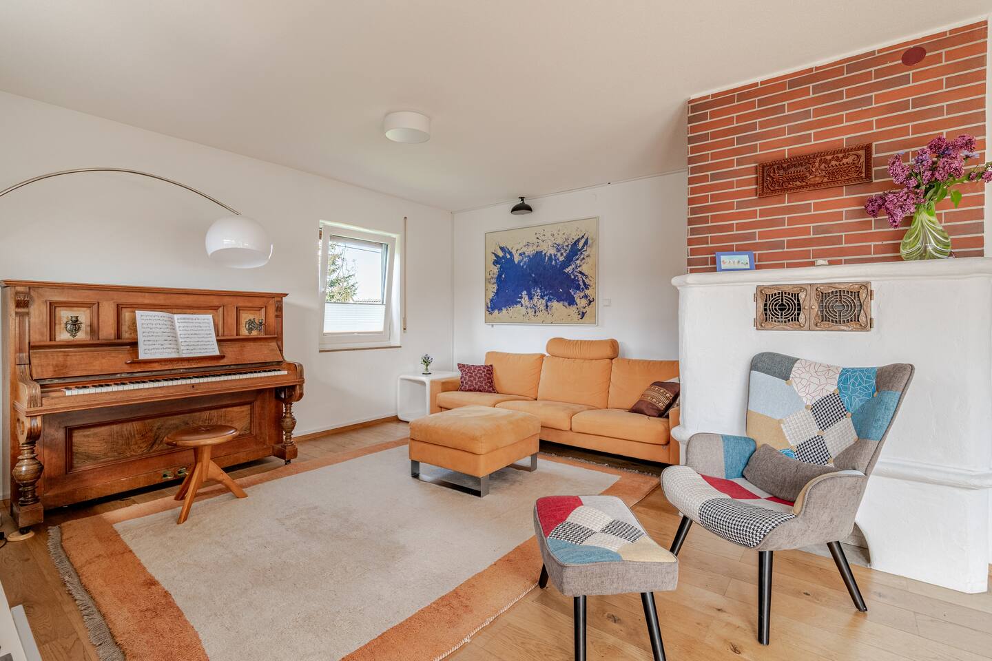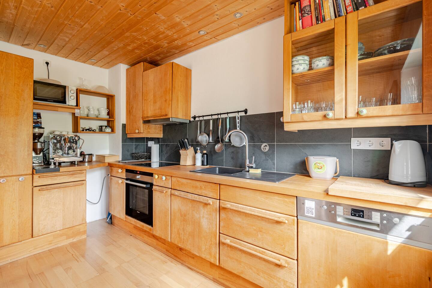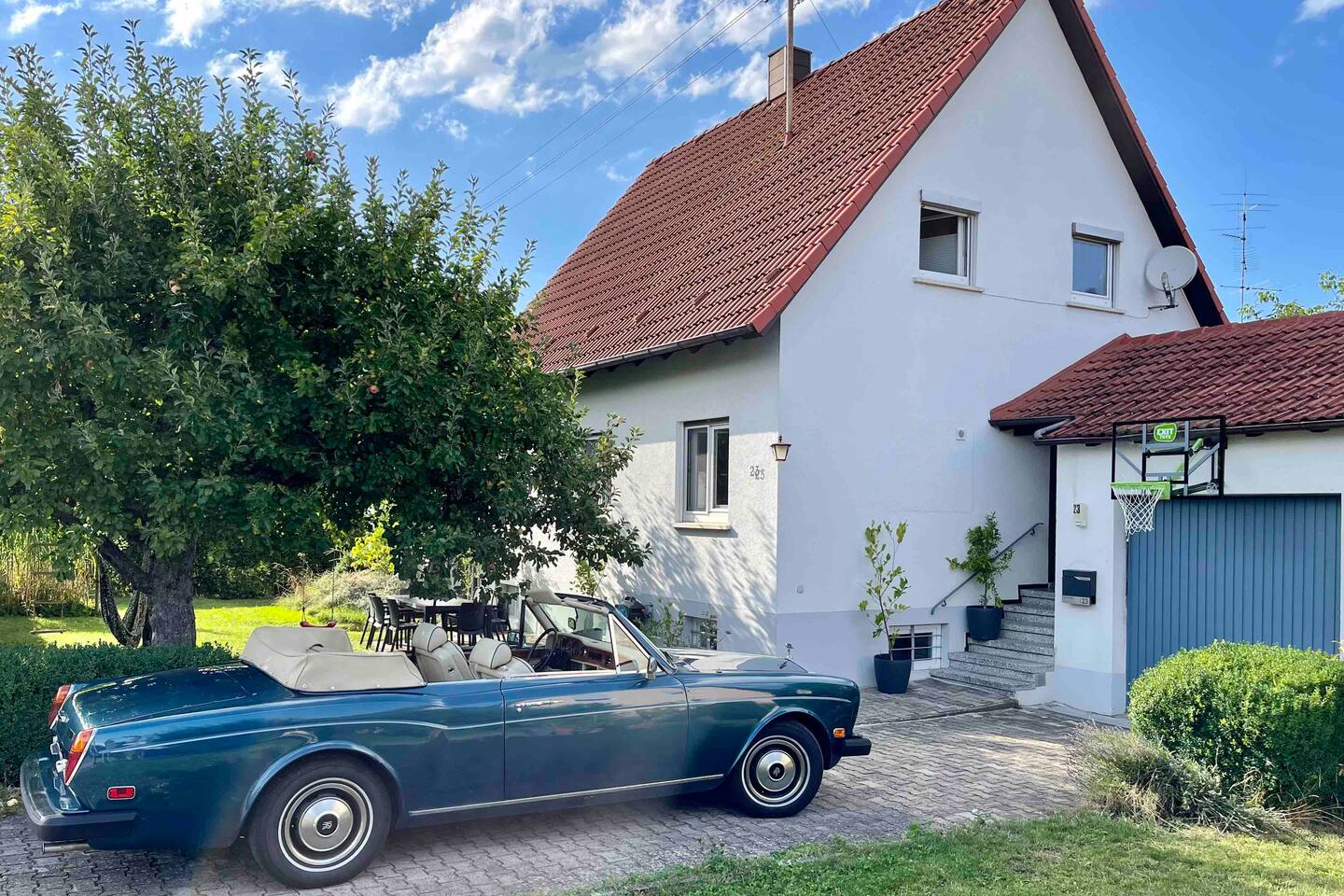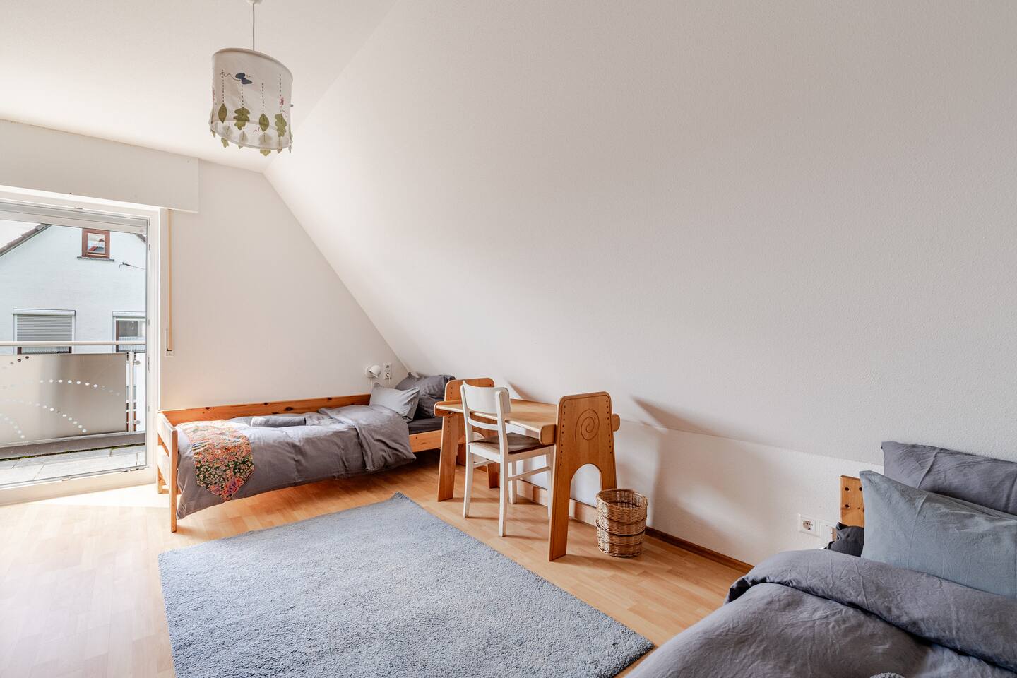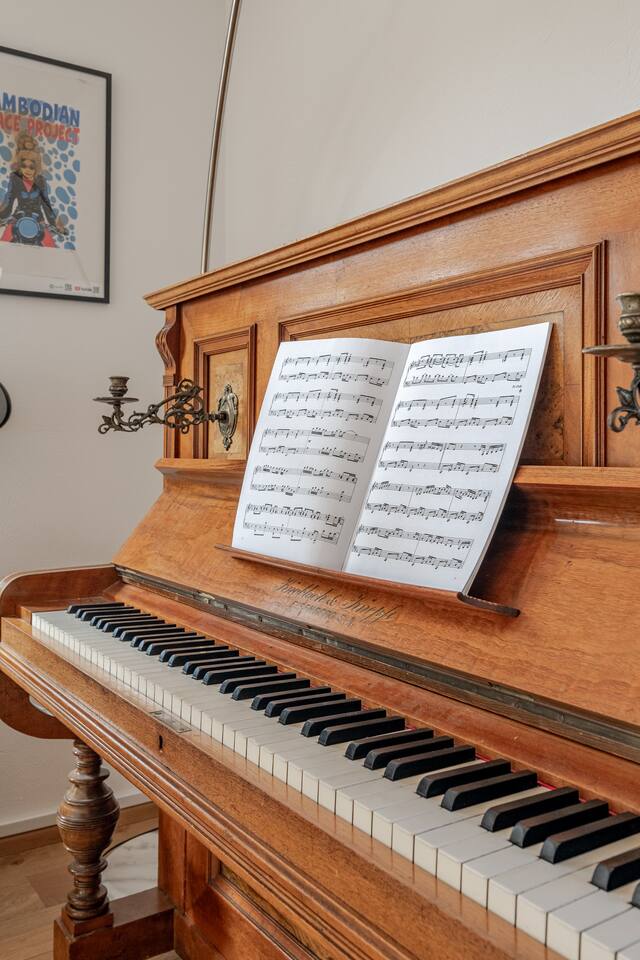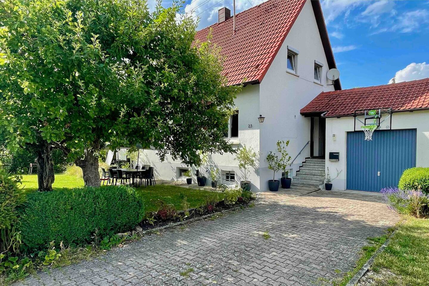 Ground floor: Spacious living-dining area. Fully equipped open kitchen incl. dishwasher. Antique dining table. Barista coffee machine. Warming stove (with uncomplicated oil central heating). Comfortable sofa invites you to linger and watch the 75 inch Smart-TV. Piano. Conservatory with citrus plants, further dining table, table football, toys. Guest WC. Upstairs with 3 bedrooms and spacious bright bathroom. Room 1: A king-size (200 x 200 cm) comfort bed ("Hüssler-Nest"). Room 2: Double bed (140 x 200 cm) and desk. Room 3: Two single beds (90 x 200 cm), children's books, toys to share and a desk. Basement: 1 bedroom and laundry room. Room 4: A pull-out day bed (160 x 200 cm) and a desk with Smart TV. Laundry room: Washing machine and tumble dryer. Garden: Detached house surrounded by garden with two shady apple trees and barbecue. Two parking spaces available on the property and free public parking. An electric car can be charged at the house with charging power limited to 2.4kW. 22kW connection in 800m. Wifi up to 50Mbit/s Expect to find everything you need for a perfect stay for one or two families with small and big children or as an adult travel group with up to 8 people plus an infant.