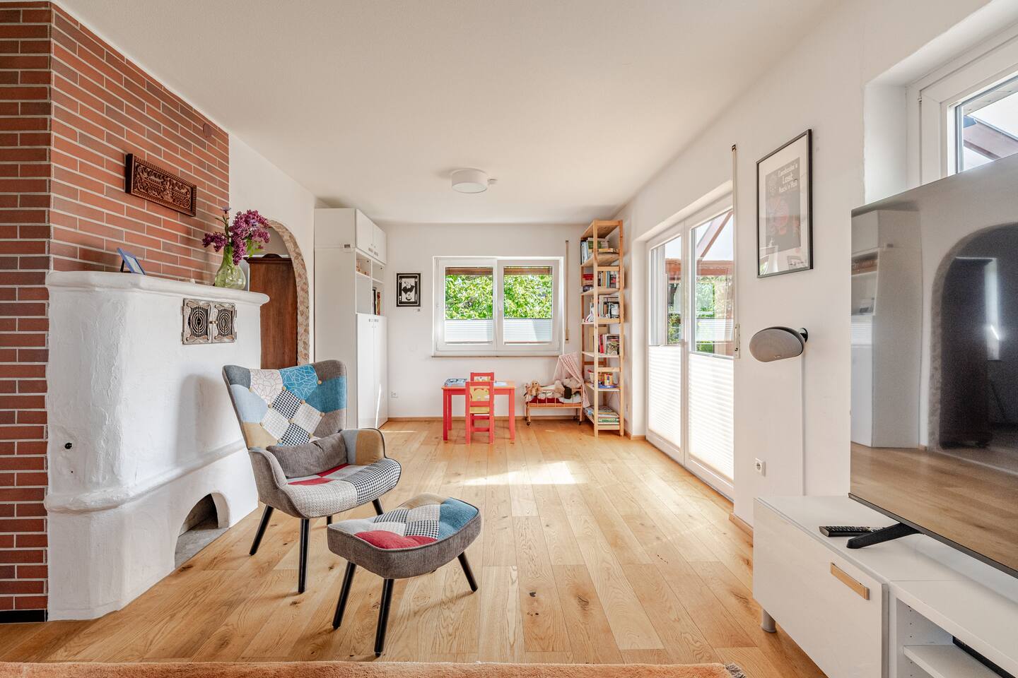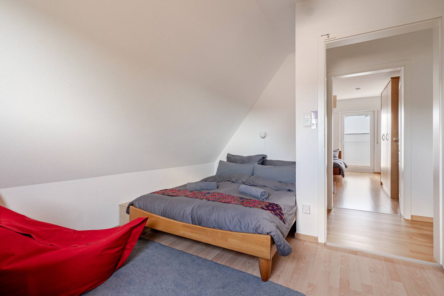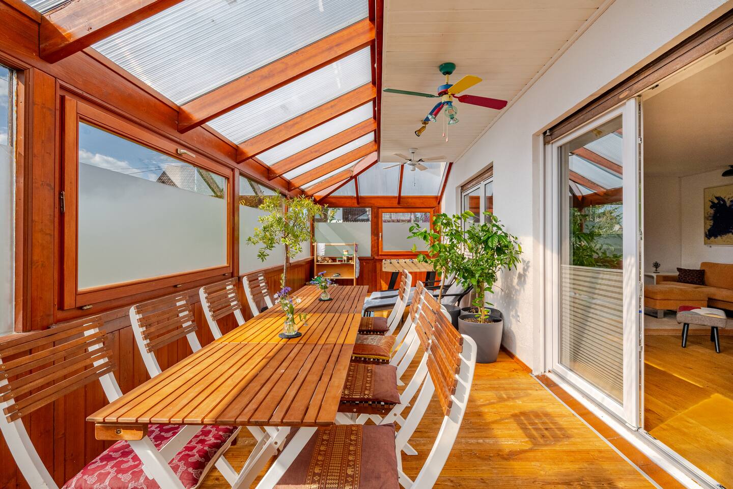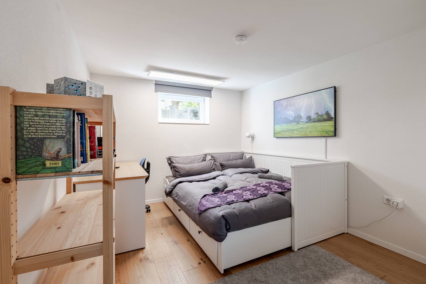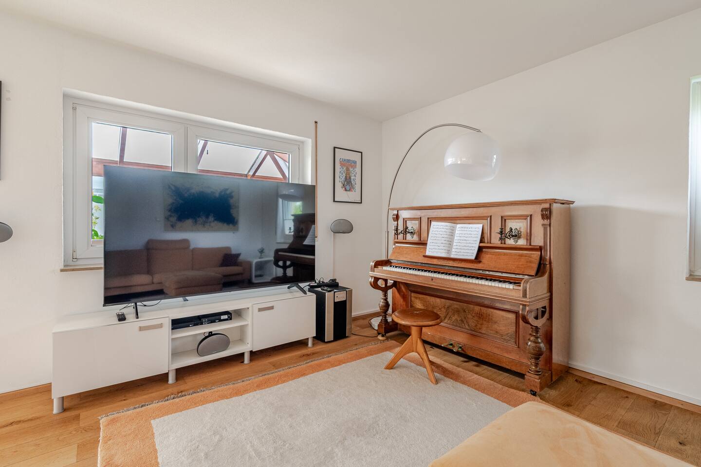 Ground floor: Spacious living-dining area. Fully equipped open kitchen incl. dishwasher. Antique dining table. Barista coffee machine. Warming stove (with uncomplicated oil central heating). Comfortable sofa invites you to linger and watch the 75 inch Smart-TV. Piano. Conservatory with citrus plants, further dining table, table football, toys. Guest WC. Upstairs with 3 bedrooms and spacious bright bathroom. Room 1: A king-size (200 x 200 cm) comfort bed ("Hüssler-Nest"). Room 2: Double bed (140 x 200 cm) and desk. Room 3: Two single beds (90 x 200 cm), children's books, toys to share and a desk. Basement: 1 bedroom and laundry room. Room 4: A pull-out day bed (160 x 200 cm) and a desk with Smart TV. Laundry room: Washing machine and tumble dryer. Garden: Detached house surrounded by garden with two shady apple trees and barbecue. Two parking spaces available on the property and free public parking. An electric car can be charged at the house with charging power limited to 2.4kW. 22kW connection in 800m. Wifi up to 50Mbit/s Expect to find everything you need for a perfect stay for one or two families with small and big children or as an adult travel group with up to 8 people plus an infant.