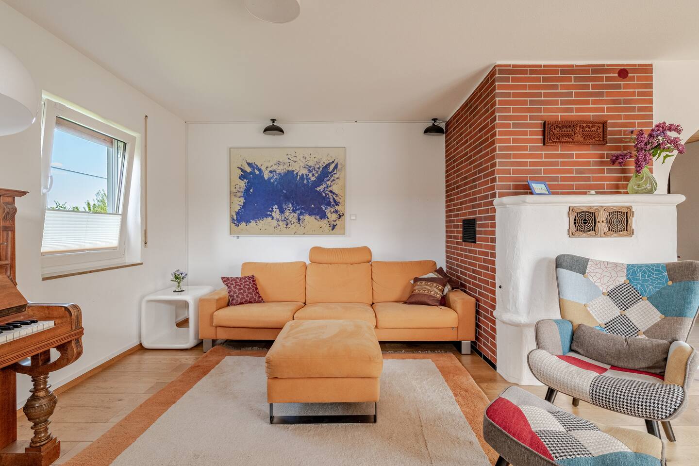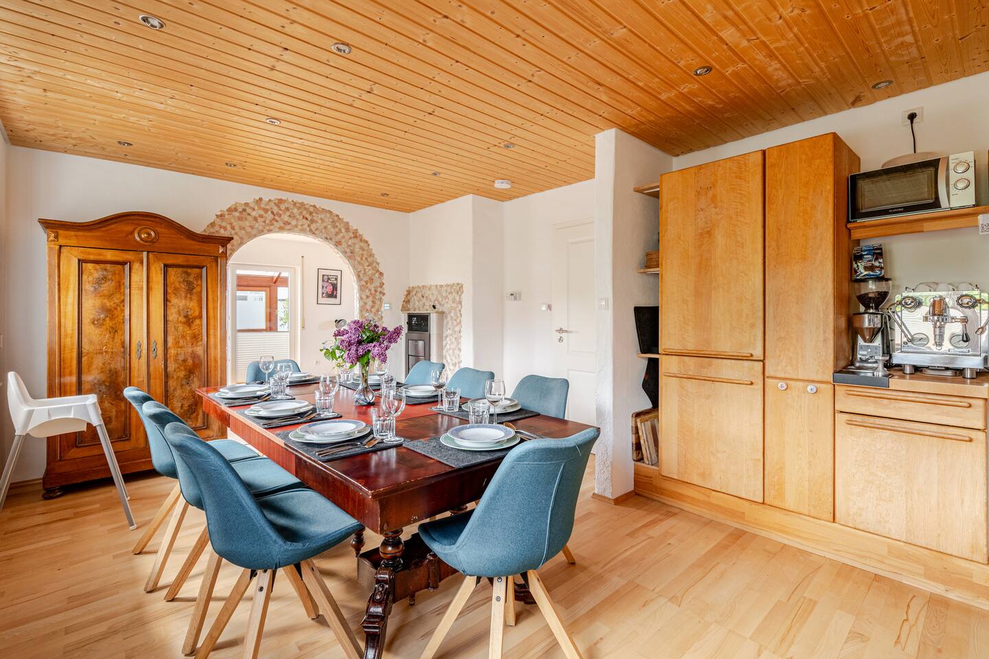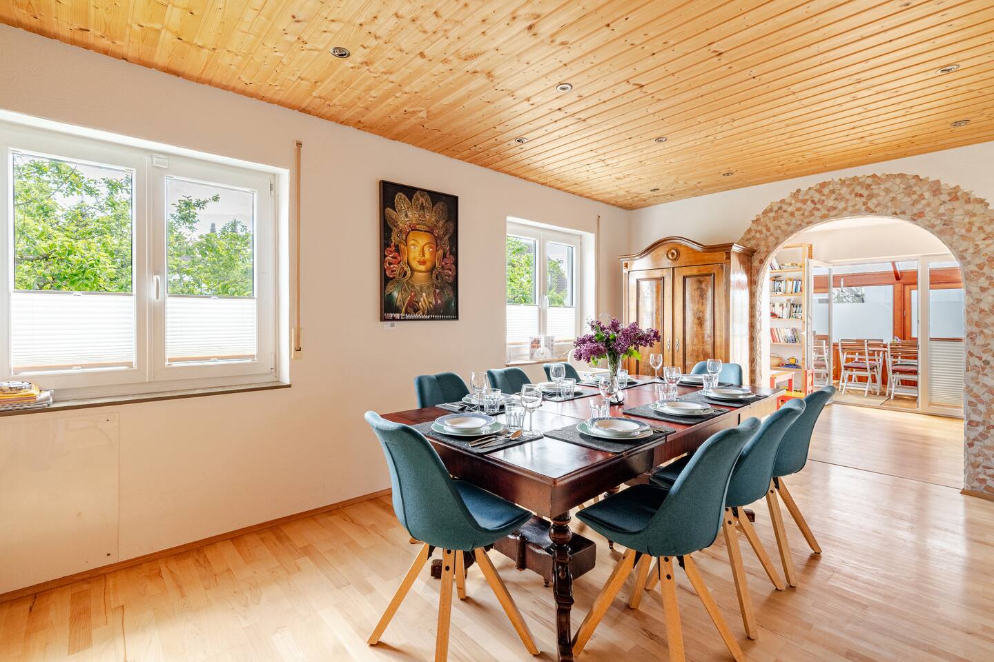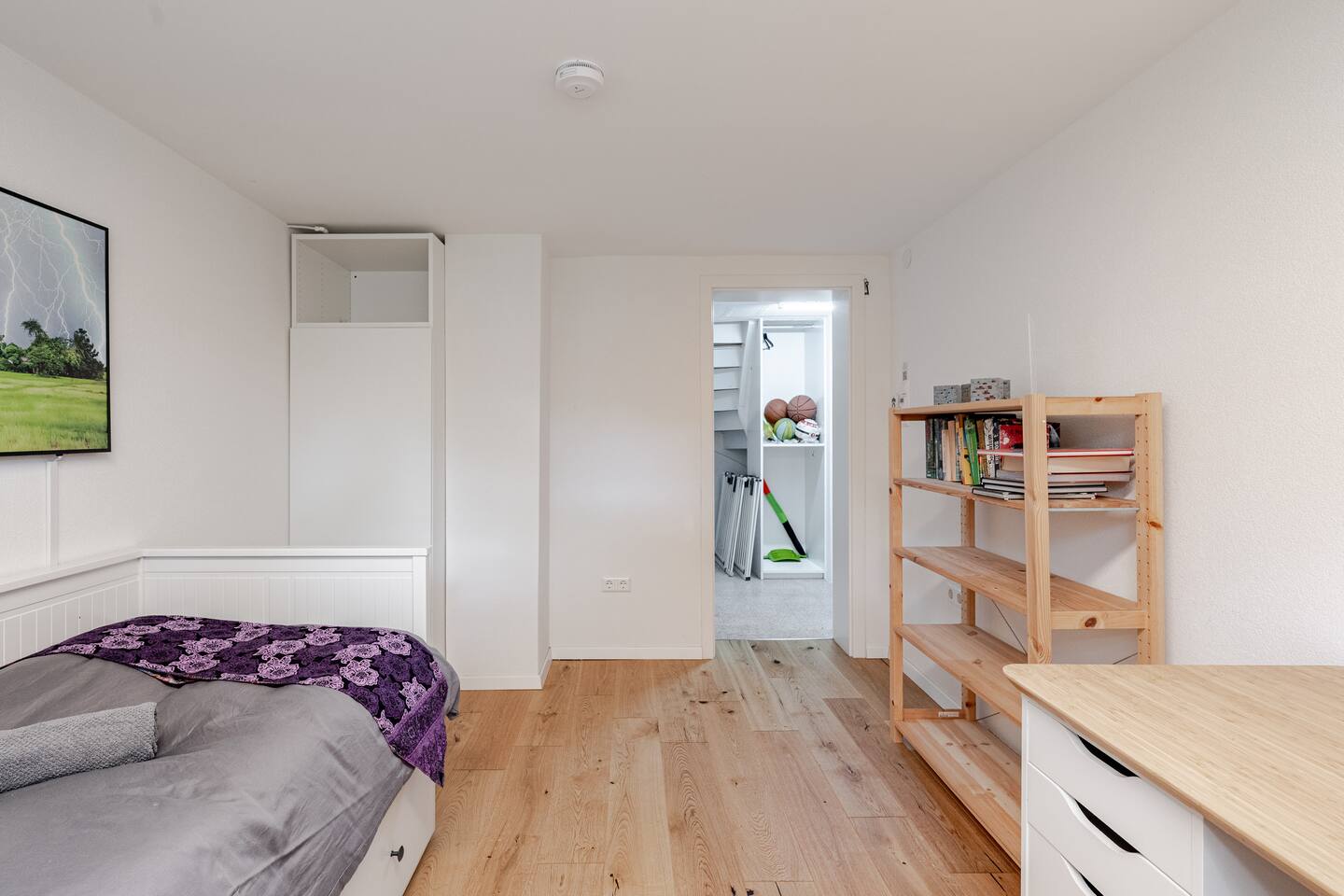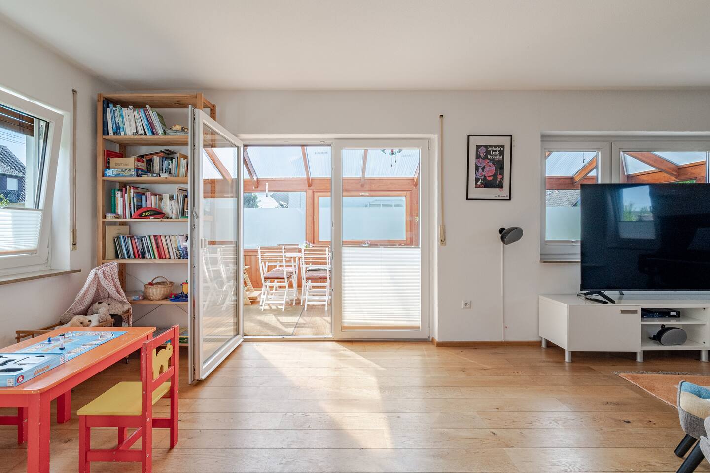 Ground floor: Spacious living-dining area. Fully equipped open kitchen incl. dishwasher. Antique dining table. Barista coffee machine. Warming stove (with uncomplicated oil central heating). Comfortable sofa invites you to linger and watch the 75 inch Smart-TV. Piano. Conservatory with citrus plants, further dining table, table football, toys. Guest WC. Upstairs with 3 bedrooms and spacious bright bathroom. Room 1: A king-size (200 x 200 cm) comfort bed ("Hüssler-Nest"). Room 2: Double bed (140 x 200 cm) and desk. Room 3: Two single beds (90 x 200 cm), children's books, toys to share and a desk. Basement: 1 bedroom and laundry room. Room 4: A pull-out day bed (160 x 200 cm) and a desk with Smart TV. Laundry room: Washing machine and tumble dryer. Garden: Detached house surrounded by garden with two shady apple trees and barbecue. Two parking spaces available on the property and free public parking. An electric car can be charged at the house with charging power limited to 2.4kW. 22kW connection in 800m. Wifi up to 50Mbit/s Expect to find everything you need for a perfect stay for one or two families with small and big children or as an adult travel group with up to 8 people plus an infant.