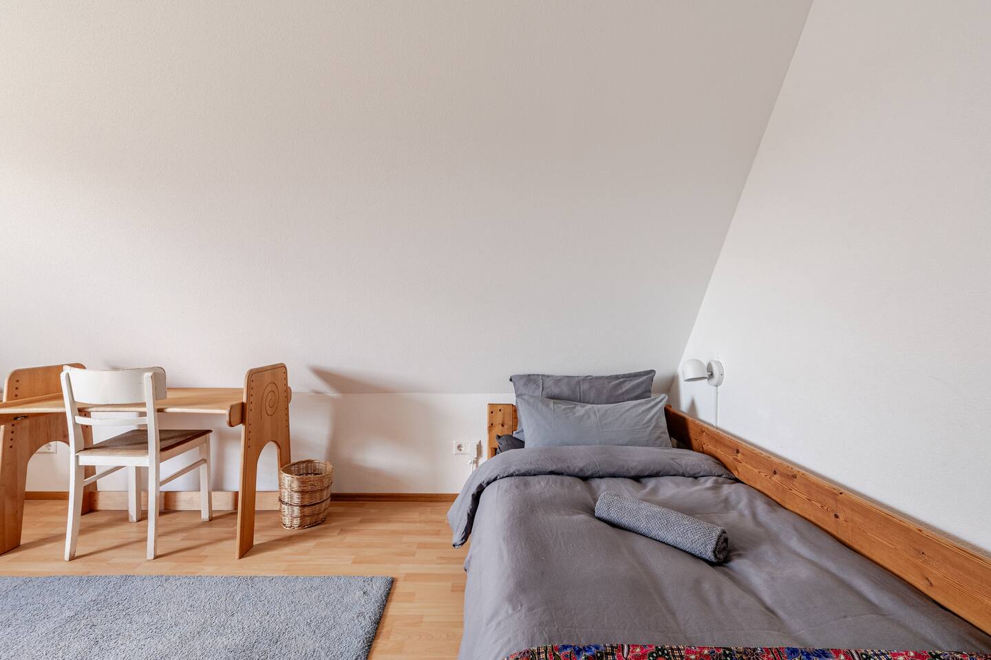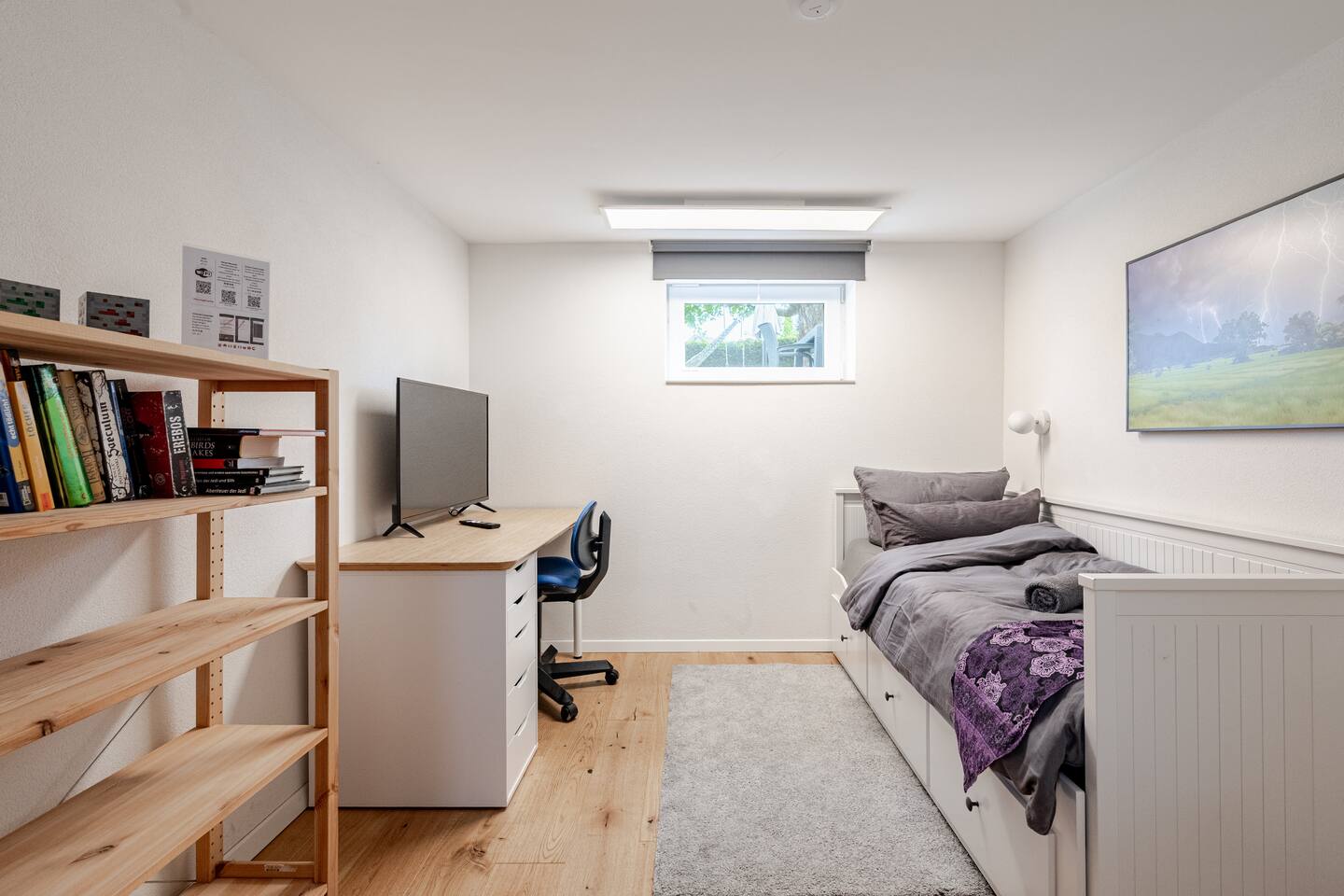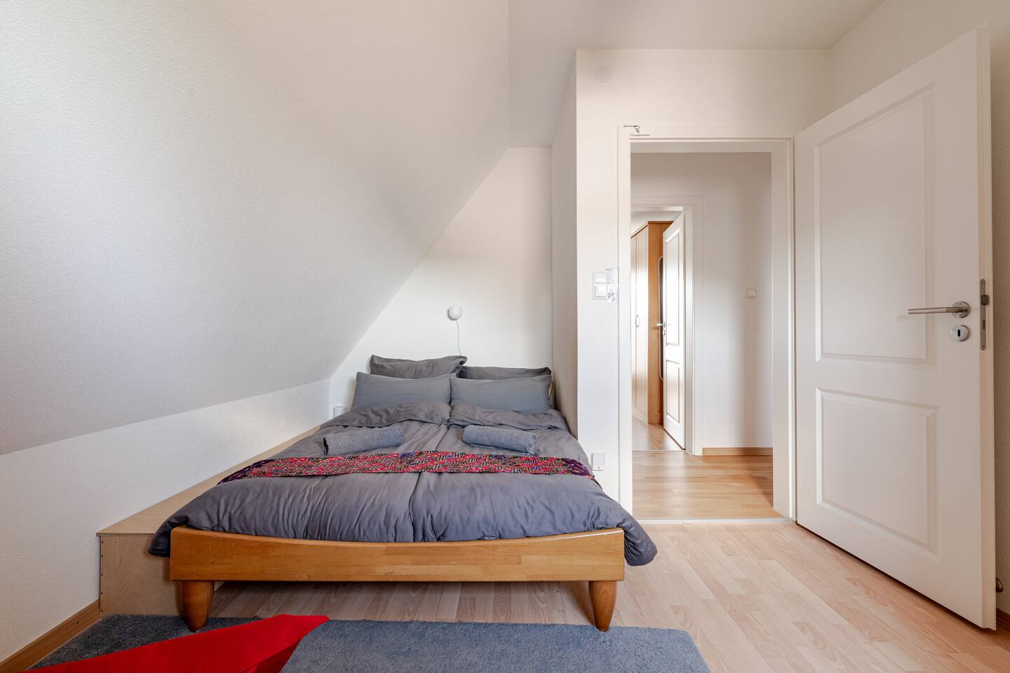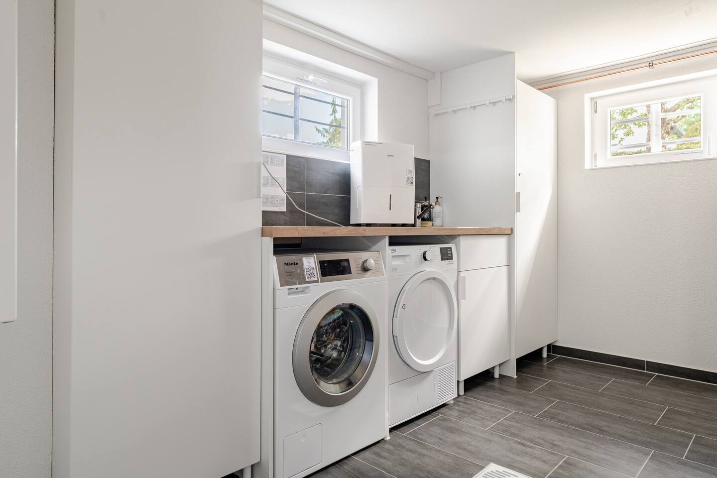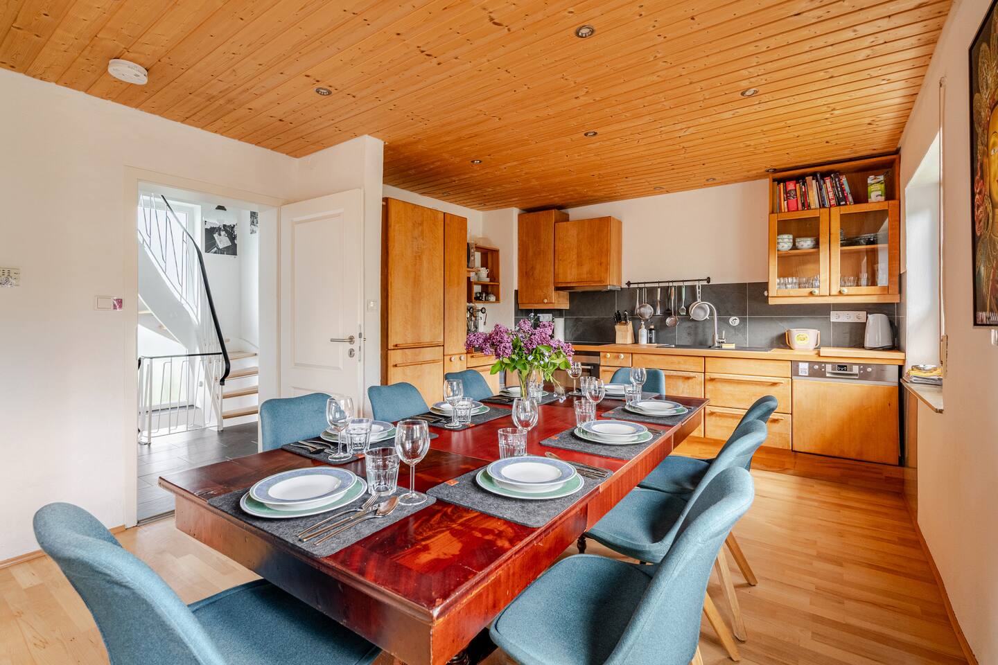Ground floor: Spacious living-dining area. Fully equipped open kitchen incl. dishwasher. Antique dining table. Barista coffee machine. Warming stove (with uncomplicated oil central heating). Comfortable sofa invites you to linger and watch the 75 inch Smart-TV. Piano. Conservatory with citrus plants, further dining table, table football, toys. Guest WC. Upstairs with 3 bedrooms and spacious bright bathroom. Room 1: A king-size (200 x 200 cm) comfort bed ("Hüssler-Nest"). Room 2: Double bed (140 x 200 cm) and desk. Room 3: Two single beds (90 x 200 cm), children's books, toys to share and a desk. Basement: 1 bedroom and laundry room. Room 4: A pull-out day bed (160 x 200 cm) and a desk with Smart TV. Laundry room: Washing machine and tumble dryer. Garden: Detached house surrounded by garden with two shady apple trees and barbecue. Two parking spaces available on the property and free public parking. An electric car can be charged at the house with charging power limited to 2.4kW. 22kW connection in 800m. Wifi up to 50Mbit/s Expect to find everything you need for a perfect stay for one or two families with small and big children or as an adult travel group with up to 8 people plus an infant.