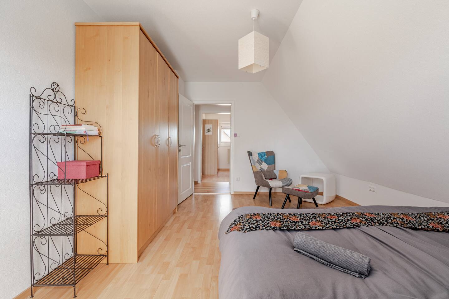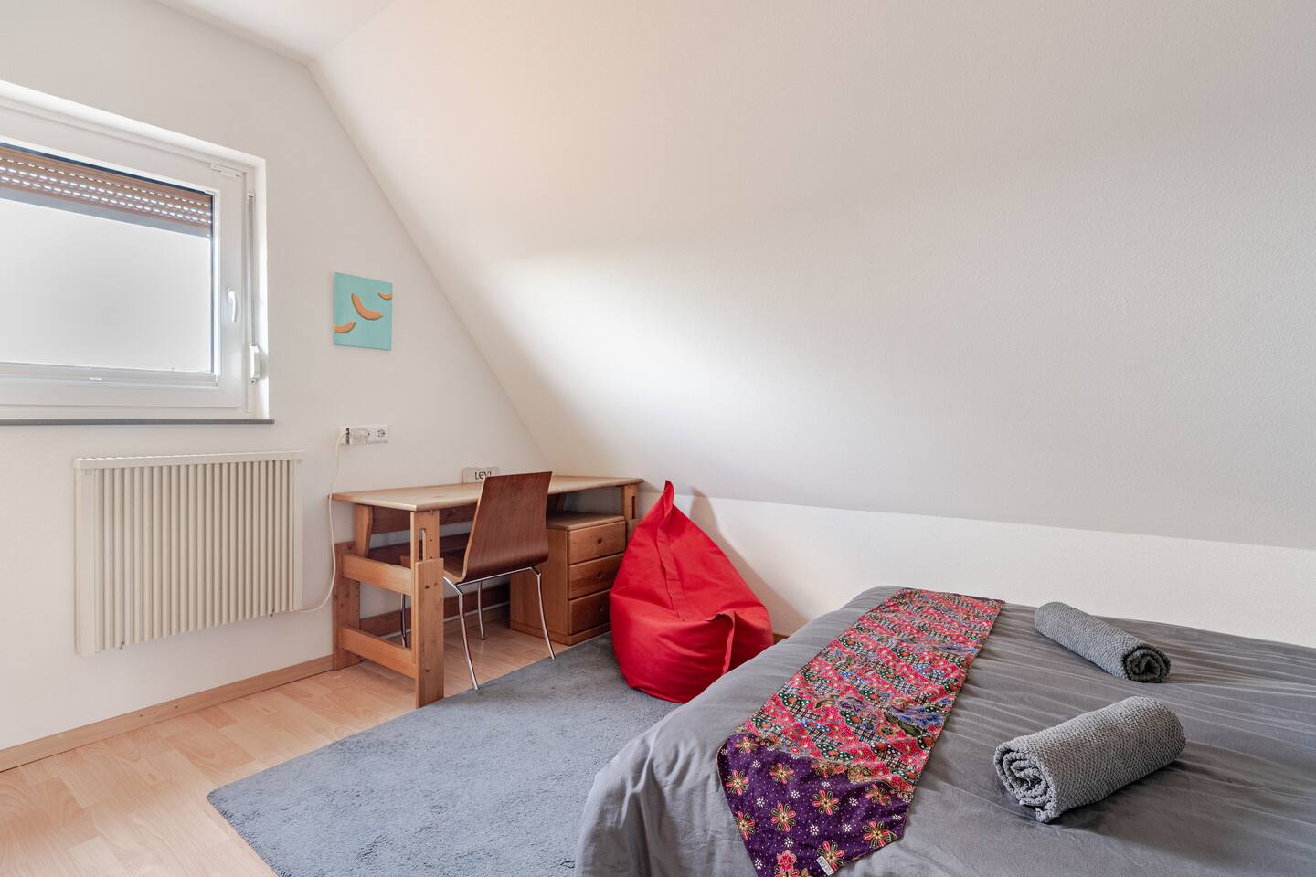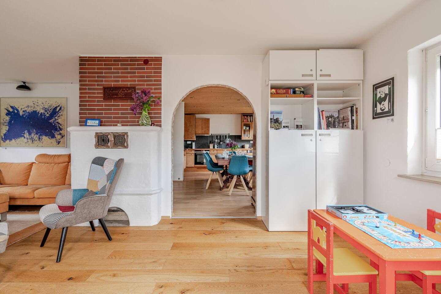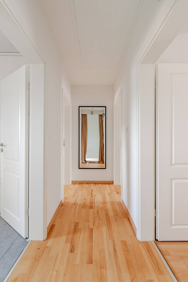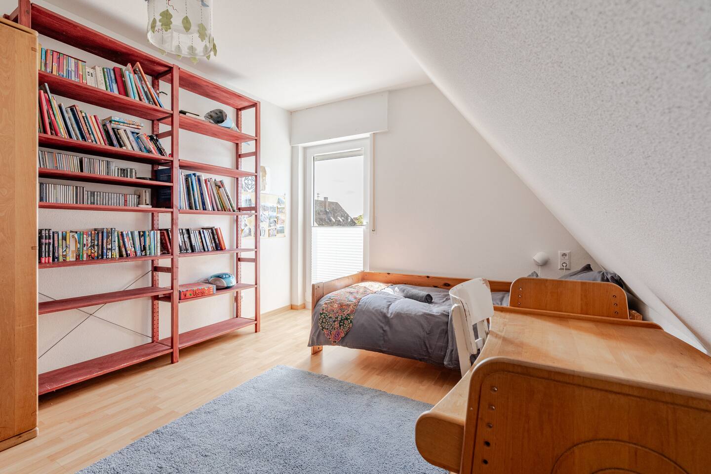 Ground floor: Spacious living-dining area. Fully equipped open kitchen incl. dishwasher. Antique dining table. Barista coffee machine. Warming stove (with uncomplicated oil central heating). Comfortable sofa invites you to linger and watch the 75 inch Smart-TV. Piano. Conservatory with citrus plants, further dining table, table football, toys. Guest WC. Upstairs with 3 bedrooms and spacious bright bathroom. Room 1: A king-size (200 x 200 cm) comfort bed ("Hüssler-Nest"). Room 2: Double bed (140 x 200 cm) and desk. Room 3: Two single beds (90 x 200 cm), children's books, toys to share and a desk. Basement: 1 bedroom and laundry room. Room 4: A pull-out day bed (160 x 200 cm) and a desk with Smart TV. Laundry room: Washing machine and tumble dryer. Garden: Detached house surrounded by garden with two shady apple trees and barbecue. Two parking spaces available on the property and free public parking. An electric car can be charged at the house with charging power limited to 2.4kW. 22kW connection in 800m. Wifi up to 50Mbit/s Expect to find everything you need for a perfect stay for one or two families with small and big children or as an adult travel group with up to 8 people plus an infant.
