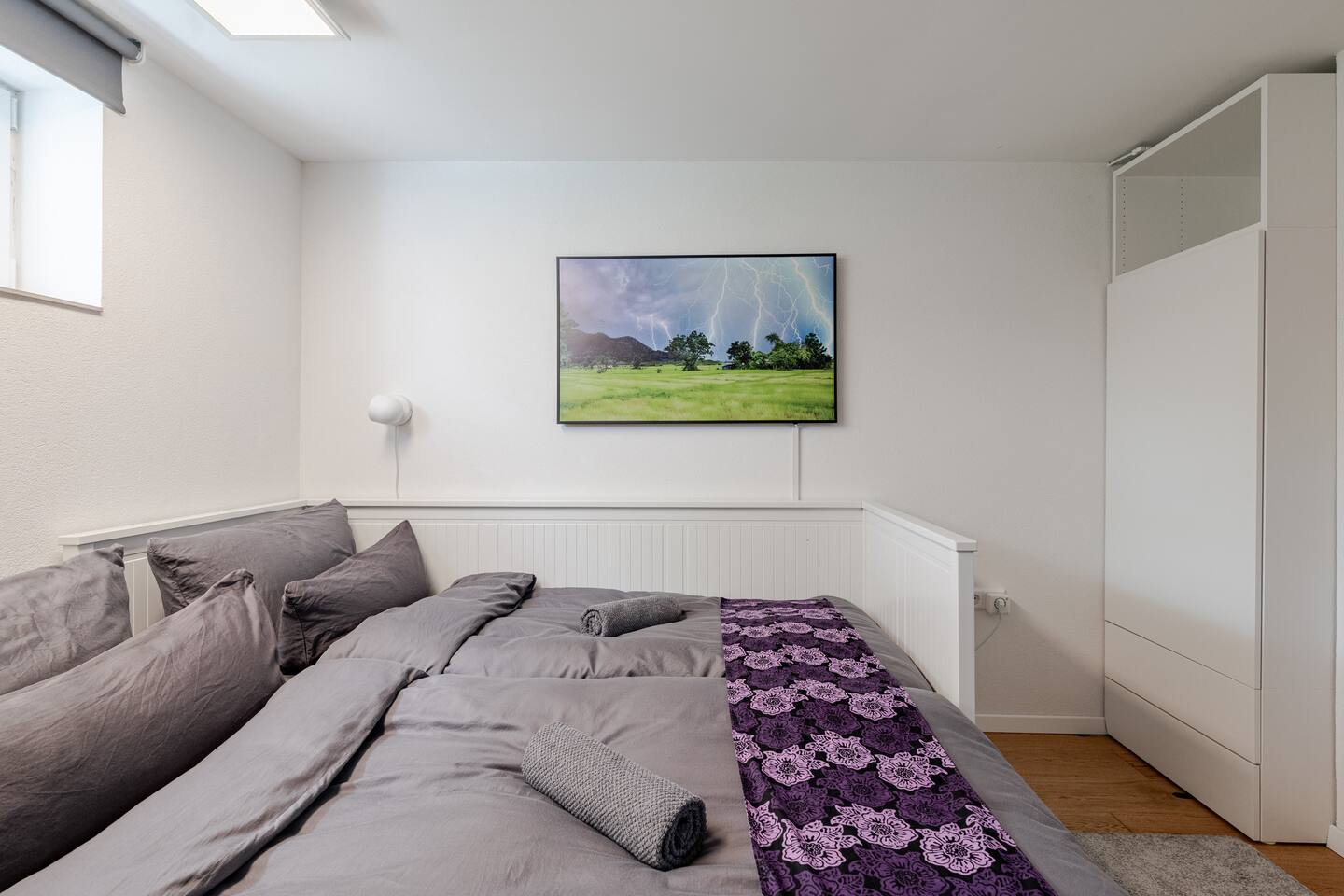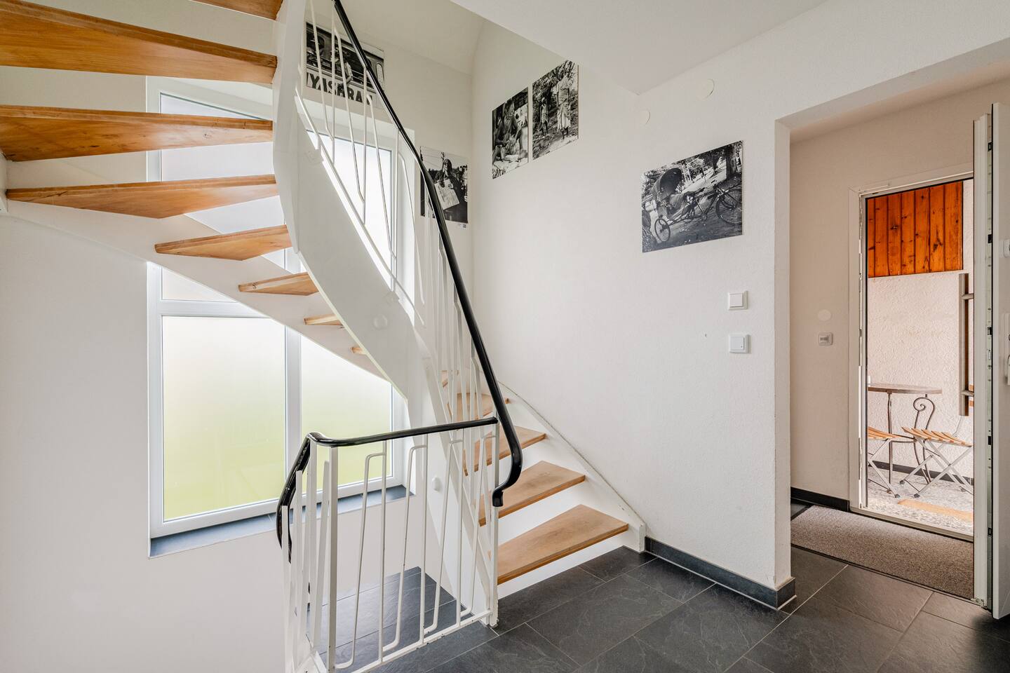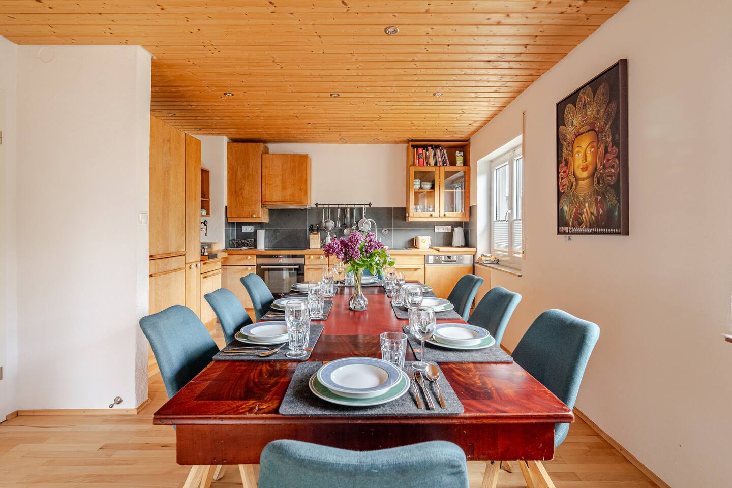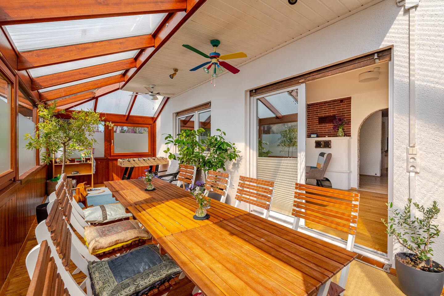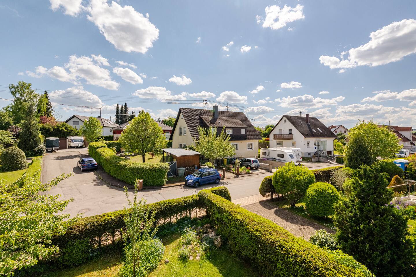 Ground floor: Spacious living-dining area. Fully equipped open kitchen incl. dishwasher. Antique dining table. Barista coffee machine. Warming stove (with uncomplicated oil central heating). Comfortable sofa invites you to linger and watch the 75 inch Smart-TV. Piano. Conservatory with citrus plants, further dining table, table football, toys. Guest WC. Upstairs with 3 bedrooms and spacious bright bathroom. Room 1: A king-size (200 x 200 cm) comfort bed ("Hüssler-Nest"). Room 2: Double bed (140 x 200 cm) and desk. Room 3: Two single beds (90 x 200 cm), children's books, toys to share and a desk. Basement: 1 bedroom and laundry room. Room 4: A pull-out day bed (160 x 200 cm) and a desk with Smart TV. Laundry room: Washing machine and tumble dryer. Garden: Detached house surrounded by garden with two shady apple trees and barbecue. Two parking spaces available on the property and free public parking. An electric car can be charged at the house with charging power limited to 2.4kW. 22kW connection in 800m. Wifi up to 50Mbit/s Expect to find everything you need for a perfect stay for one or two families with small and big children or as an adult travel group with up to 8 people plus an infant.