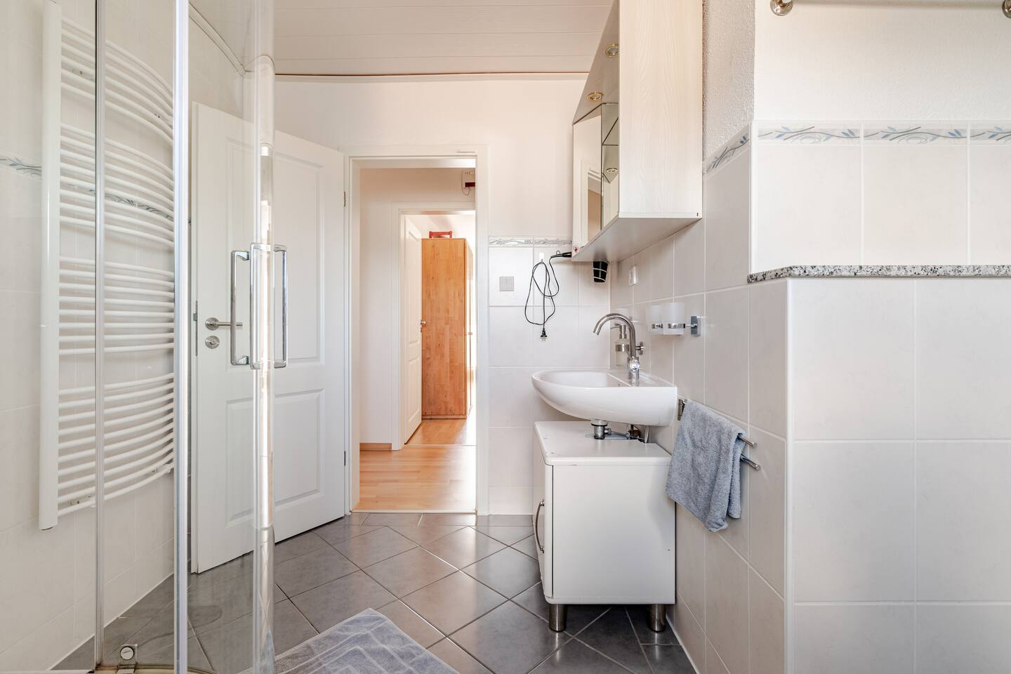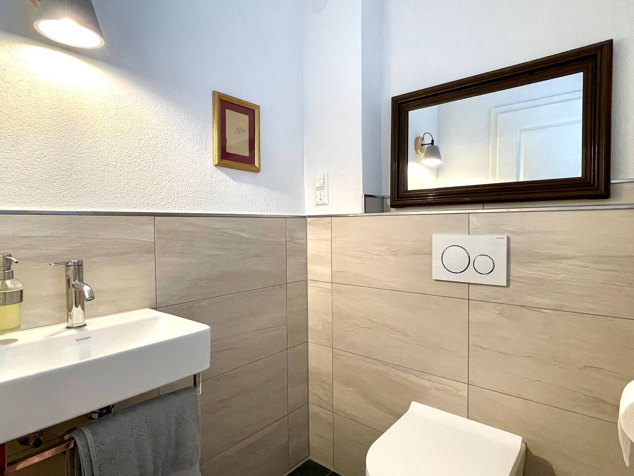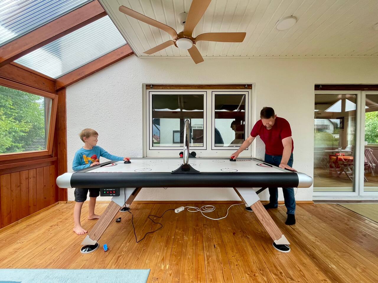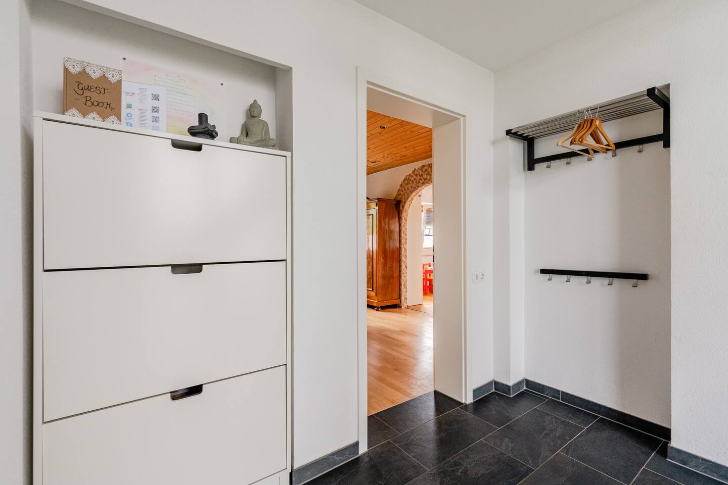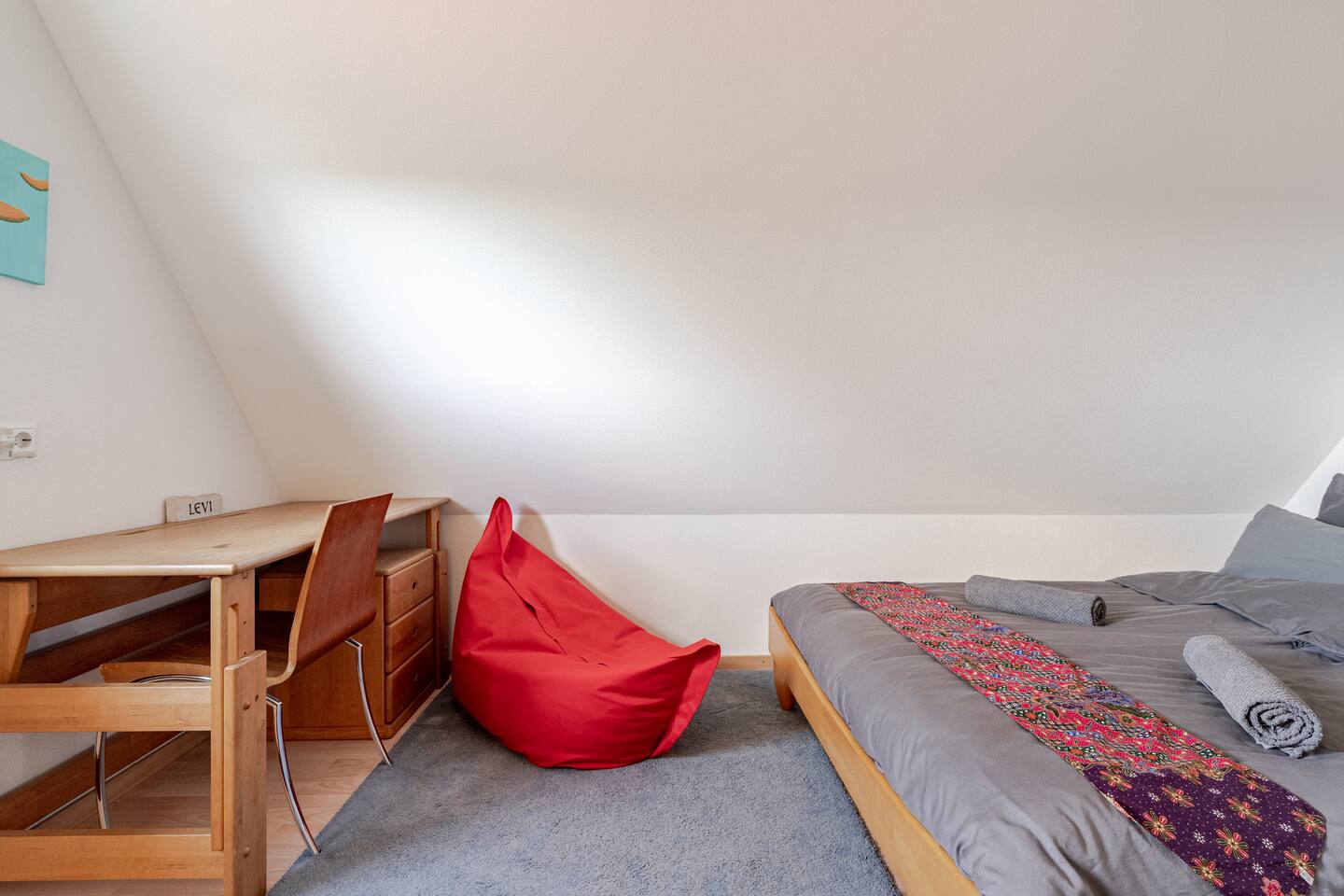 Ground floor: Spacious living-dining area. Fully equipped open kitchen incl. dishwasher. Antique dining table. Barista coffee machine. Warming stove (with uncomplicated oil central heating). Comfortable sofa invites you to linger and watch the 75 inch Smart-TV. Piano. Conservatory with citrus plants, further dining table, table football, toys. Guest WC. Upstairs with 3 bedrooms and spacious bright bathroom. Room 1: A king-size (200 x 200 cm) comfort bed ("Hüssler-Nest"). Room 2: Double bed (140 x 200 cm) and desk. Room 3: Two single beds (90 x 200 cm), children's books, toys to share and a desk. Basement: 1 bedroom and laundry room. Room 4: A pull-out day bed (160 x 200 cm) and a desk with Smart TV. Laundry room: Washing machine and tumble dryer. Garden: Detached house surrounded by garden with two shady apple trees and barbecue. Two parking spaces available on the property and free public parking. An electric car can be charged at the house with charging power limited to 2.4kW. 22kW connection in 800m. Wifi up to 50Mbit/s Expect to find everything you need for a perfect stay for one or two families with small and big children or as an adult travel group with up to 8 people plus an infant.
